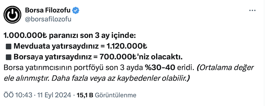 Borsa Filozofu’nun yaptığı paylaşıma göre 1 milyon TL son 3 ayda mevduata yatırılsaydı 1 milyon 120 bin TL, borsaya yatırılsaydı 700 bin TL olacaktı.