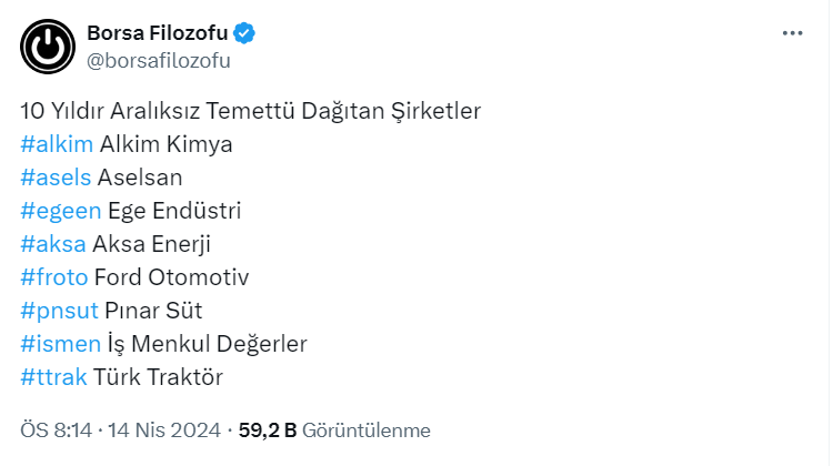 239,2 bin takipçili Borsa Filozofu resmi X hesabı https://twitter.com/borsafilozofu üzerinden 10 yıldır aralıksız temettü dağıtan 8 şirketi paylaştı. İşte Borsa Filozofu'nun yaptığı o paylaşım ve paylaşıma gelen yorumlar...