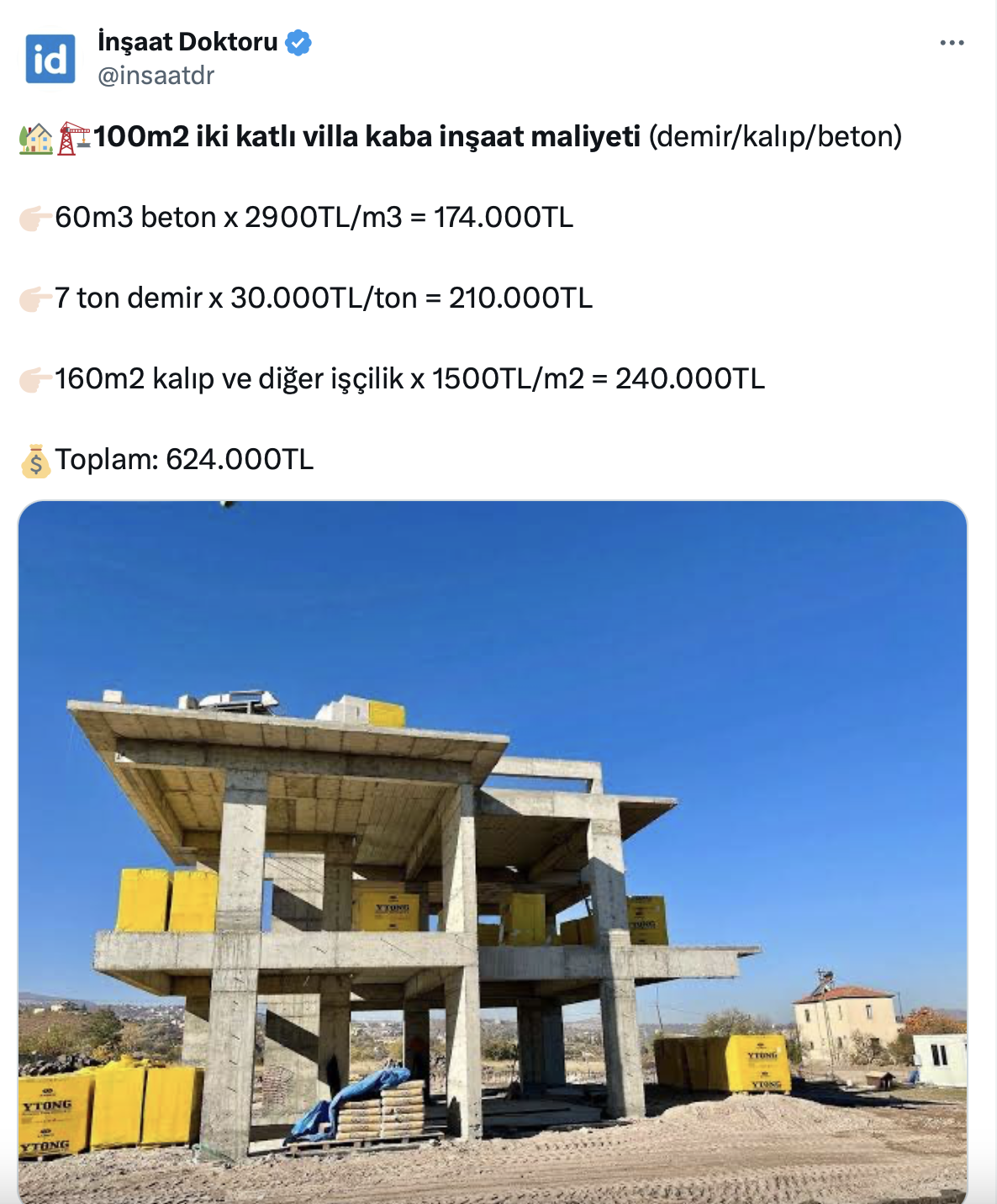Resmi sosyal medya hesabı üzerinden yaptığı paylaşımlarla dikkat çeken 42 bin takipçili İnşaat Doktoru bu kez de inşaat maliyetleri ilgili bir paylaşım yaptı.