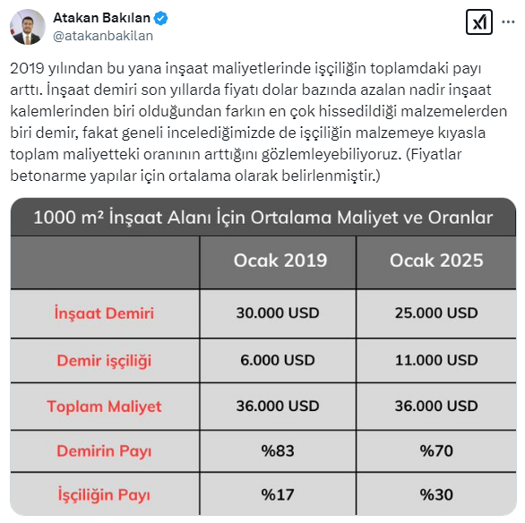 2019 yılından bu yana inşaat maliyetlerinde işçiliğin toplamdaki payı arttı. İnşaat demiri son yıllarda fiyatı dolar bazında azalan nadir inşaat kalemlerinden biri olduğunu söyleyen İnşaat mühendisi Atakan Bakılan, genele bakıldığında işçiliğin malzemeye kıyasla toplam maliyetteki oranının arttığını açıkladı.
