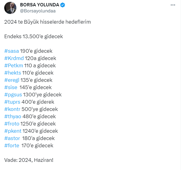 Yatırımcıların gündeminden düşmeyen Borsa'nın nasıl bir seyir izleyeceği merak edilirken, 14 yıllık borsacı Borsa Yolunda, resmi sosyal medya hesabı https://twitter.com/Borsayolundaa yaptığı paylaşımda 2024'te büyük hisselerde hedeflerini açıkladı.
