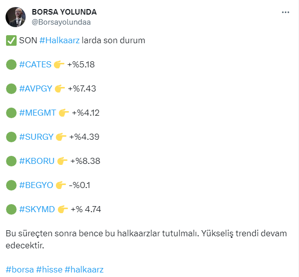 14 yıllık borsacı Borsa Yolunda resmi sosyal medya hesabı https://twitter.com/Borsayolundaa üzerinden yaptığı paylaşımda halka arzlarda yükseliş trendinin devam edip etmeyeceğini açıkladı.