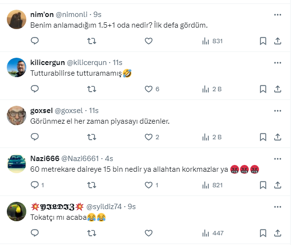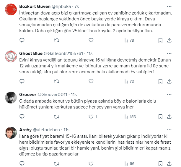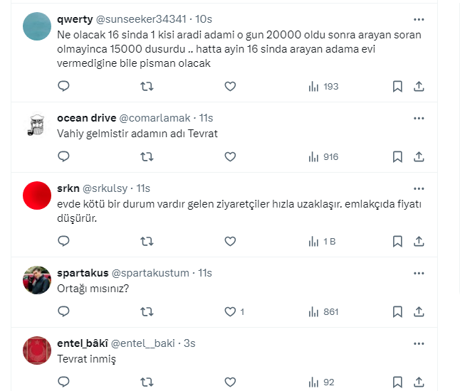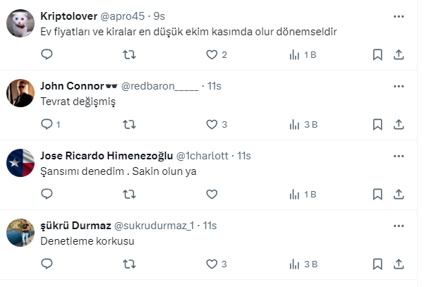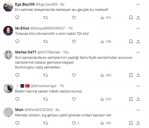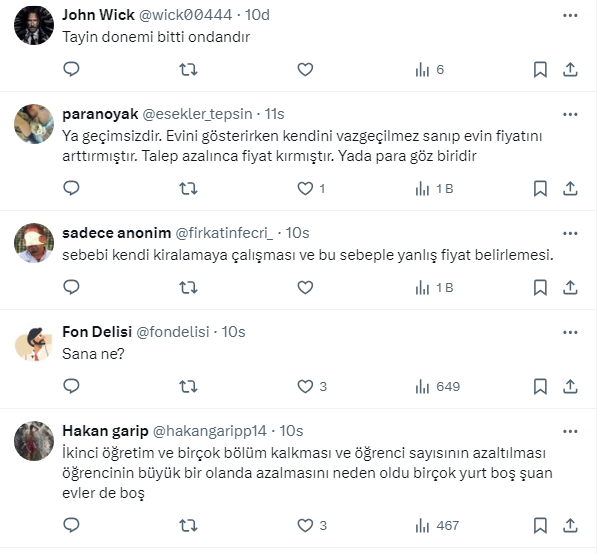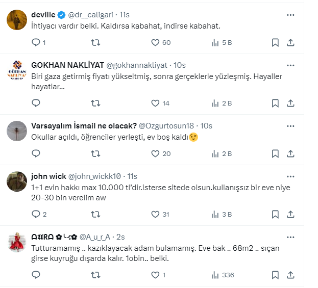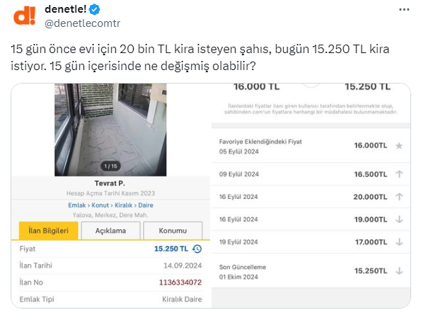 Denetim platformu, Denetlecomtr, https://x.com/denetlecomt X sosyal medya hesabından yaptığı paylaşımda Yalova’da bir ev sahibinin kiralık ilanını 15 gün içinde 20 bin TL’den 15 bin TL’ye indirdiğini açıkladı. “15 gün önce evi için 20 bin TL kira isteyen şahıs, bugün 15.250 TL kira istiyor. 15 gün içerisinde ne değişmiş olabilir?” diye sordu. Takipçilerinden cevap gecikmedi.