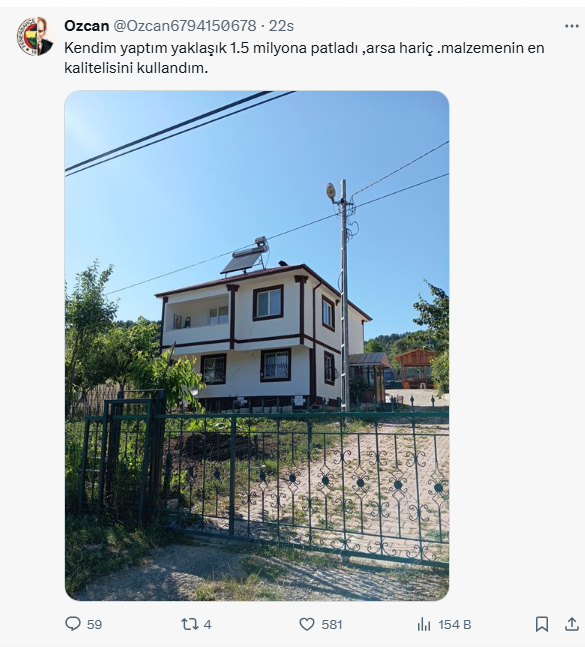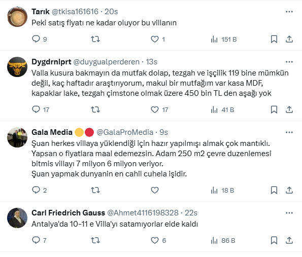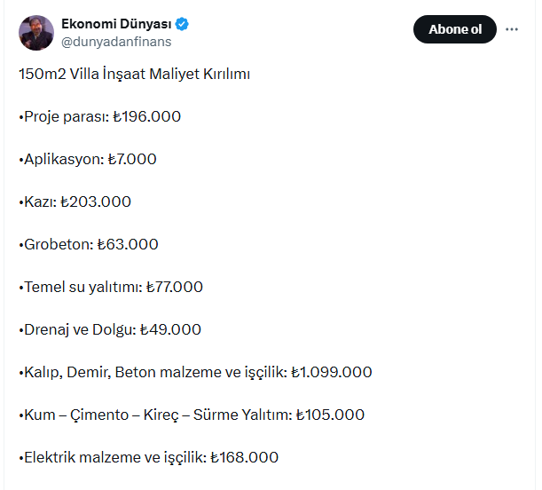Ekonomi dünyası sosyal medya hesabından villa inşaat maliyetini kalem kalem hesapladı; İşte o çarpıcı maliyet kalemleri: