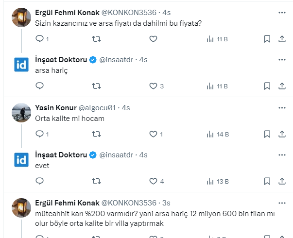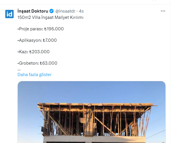 İnşaat maliyetlerinin rekor kırdığı şu günlerde, bir inşaatın maliyeti merak edelirken, inşaat doktoru sosyal medya hesabı X'ten 150 metrekarelik bir villanın maliyetini hesapladı. Peki bir villa yaptırmanın maliyeti ne kadar? İşte 150 metrekarelik bir inşaatın maliyet hesaplaması...