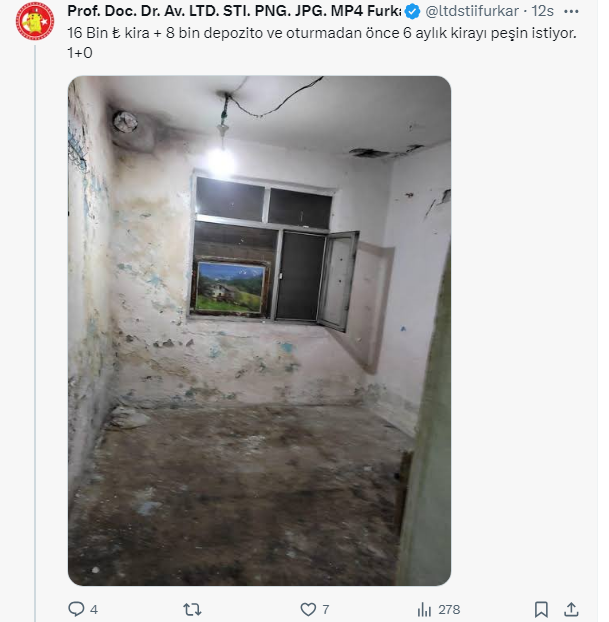Kira fiyatları davan yaparken, vatandaşlar bütçesine uygun kiralık ev arıyor. Özellikle büyük şehirlerde daha çok hissedilen fahiş kira zamları, İstanbul'da göçlere neden oldu. Hükümet yüzde 25 sınır koysa da bazı ev sahipleri bu kuralı dikakte almıyor. Kiralık ev bulmakta zorlananlar, çözümü başka kişilerin evine taşınmada veya küçük evleri tutmada buldu. Kiralık ev fiyatları gündemden düşmezken sosyal medyaya bir evin fotoğrafı düştü. İlk başta evi görenler şoke olurken kirasını görenler ise ikinci bir şoku yaşadı. Sosyam medya hesbaı X'ten Prof. Doc. Dr. Av. LTD. STI. PNG. JPG. MP4 Furkan@ltdstiifurkann adlı vatandaş çok konulukacak evi paylaştı. Altına gelen yorumlar ise hem güldürdü hem de düşündürdü...