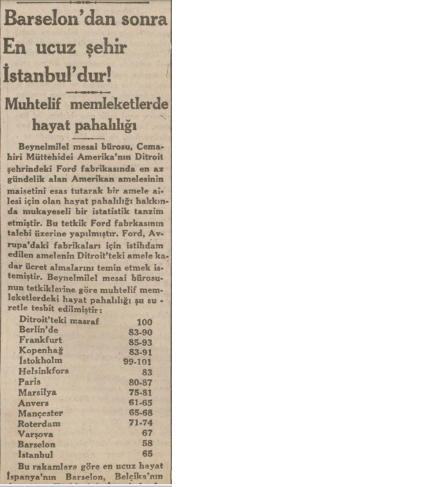 Cumhuriyet Gazetesi'in 2 Şubat 1932 yılındaki sayısında ''Barselona'dan sonra en ucuz şehir İstanbul'dur! Muhtelif memleketlerde hayat pahalılığı'' başlığı ile haber manşette yayınlanmış. İşte o haber....