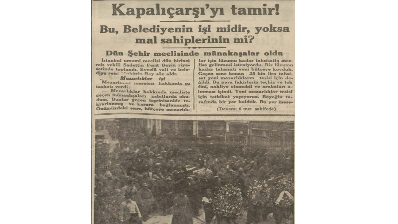 1933 yılında Kapalıçarşı'nın tamiri için 300 bin lira gerekiyormuş. Ama bu paranın kim tarafından karşılanacağı henüz netleşmemiş. Çünkü halk belediyeni karşılamasını isterken belediyede bu kadar bütçe olmadığı belirtilmiş.