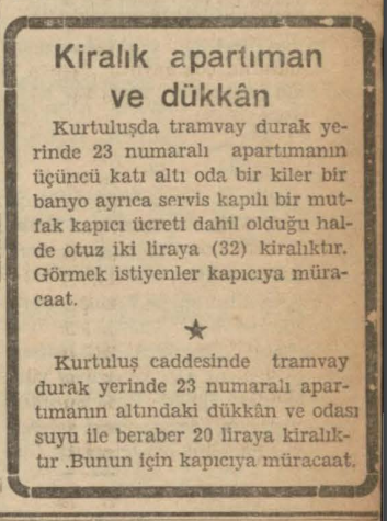 Türkiye genelinde kira ve konut fiyatları oldukça yükseldi. 1937 yılındaki gazete ilanında Kurtuluş'taki, apartmanın üçüncü katındaki kiralık daire 32 liraya kiraya veriliyormuş...