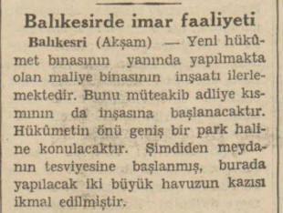 1938 yılında Balıkesir'de imar faaliyetleri başlatılmış. O dönemde inşa edilen yeni Hükümet Binası'nın çevresinde imar planı için çalışmalar yapılmış.