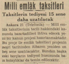 Söz konusu haber 22 Haziran 1938 tarinde Akşam Gazetesi'nde ''Milli emlak taksitleri, Takitlerin tediyesi 15 sene daha uzatılacak'' başlığı ile kaleme alınmış. İşte o haber...