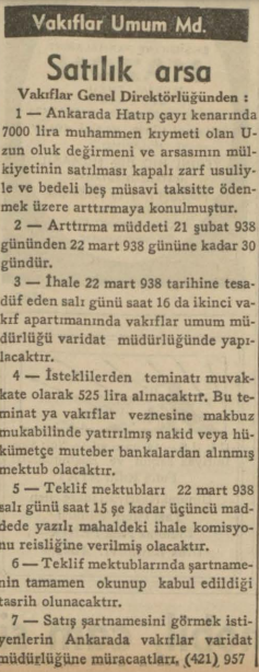 Söz konusu haber Ulus Gazetesi'nin 11 Mart 1938 tarihindeki sayısında '' Vakıflar Umum Müdürlüğü'nden satılık arsa'' başlığı ile kaleme alınmış. İşte o haber...