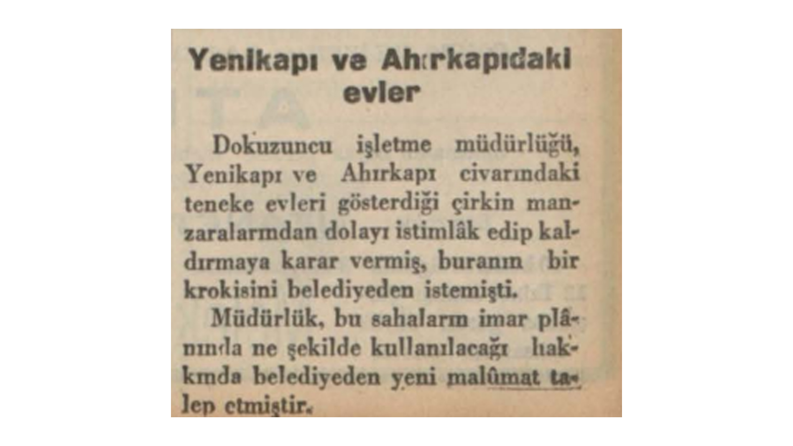 Dokuzuncu işletme müdürlüğü, Yenikapı ve Ahırkapı civarındaki teneke evleri gösterdiği çirkin manzaralarımdan dolayı istimlak edip kaldırmaya karar vermiş, buranın bir krokisini belediyeden istemişti.