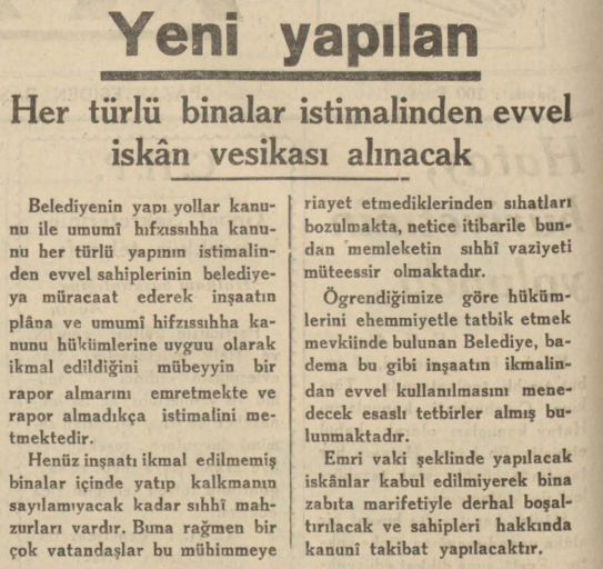 1939 yılında her yeni yapılan bina için kritik karar alınmış. Binalara yerleşilmeden önce iskan belgesinin alınması gerekliymiş.