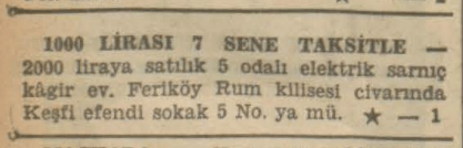 - 2000 liraya satılık 5 odalı elektrik sarnıç kagir ev. Feriköy Rum kilisesi civarında Keşfi efendi sokak 5 No. ya müracat.