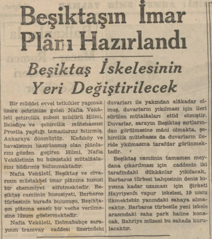 Söz konusu haber Vatan Gazetesi'nin 22 Ağustos 1940 yılındaki sayısında '' Beşiktaş'ın imar planı hazırlandı:'' başlığı ile kaleme alınmış. İşte o haber...