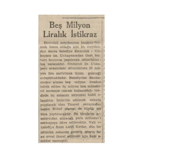 Eminönü ile Unkapanı arasındaki istimliklara 20 milyon lira sarfetmek lazım geleceği anlaşılmaktadır. Belediyeler Bankasından alman beş milyon liradan tefrik edilen üç milyon lira mütedavil sermaye olarak kullanıldığı takdirde bu sahanın istimlaki kabil olacaktır.
