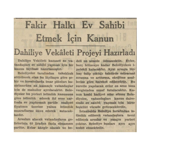 Belediyeler tarafından tahakkuk ettirilecek olan bu layihaya göre şehir ve kasabalarda imar planları hazırlanırken az kazançlı vatandaşlar için de mahalleler ayrılacaktır. Belediyeler bu yerleri istimlåk kanununa göre istimiak ederek iki sene zarfında ev yaptırmak şartı ile maliyet fiyatının üzerine yalnız Istimlak masraflarııı ilave ederek satacaklardır.