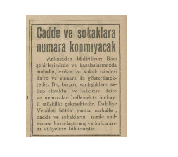 Bu, birçok yanlışlıklara sebep olmakta ve halkımız daire ve numaraları bellemekte bir hayli müşkilat çekmektedir. Dahiliye Vekäleti bütün yurtta mahalle cadde ve sokakların isimle anıl masını kararlaştırmış ve bu kararını vilayelere bildirmiştir.''