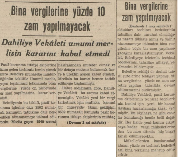 1941 yılında bina vergilerine yüzde 10 zam yapılacağına karar verilmiş fakat bugünkü adıyla İçişleri Bakanlığı tarafından iptal edilmiş.