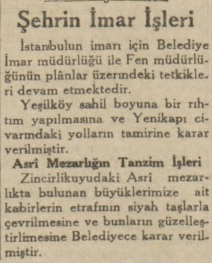 1941'de Belediye, Zincirlikuyu'daki Asrı Mezarlığı'nın etrafını siyah taşlarla çevrilmesine ve buraların güzelleştirilmesi için harekete geçmiş.