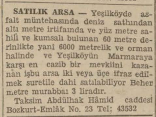 Yeşilköy'de 6000 metrelik Marmara'ya karşı konumlanan arsa 1941 yılında satışa çıkarılmış. Arsa sahibi zamanında bu taşınmazın 1 metrekaresi için 3 lira istemiş.