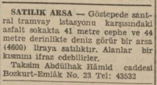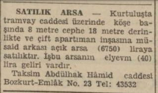 Taksim Abdülhak Hamid caddesi Bozkurt-Emlak No. 23 Tel: 43532"