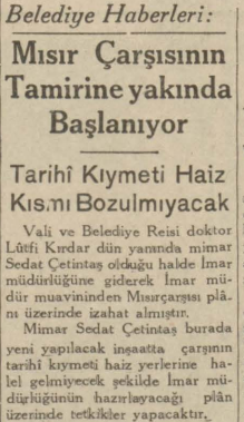 Söz konusu haber Vatan Gazetesi'nin 20 Şubar 1941 yılında 'Mısır Çarşı'nın tamirine yakından başlanıyor'' başlığı ile kaleme alınmış. İşte o haber...