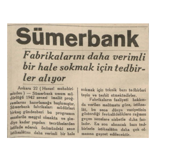 Ankara Sümerbank umum müdürlüğü 1942 senesi imalat programlarını hazırlamaya başlamış. Sümerbank fabrikalarının önümüzdeki sene daha verimli hale gelebilmesi için tedbirler almaya başlamış.
