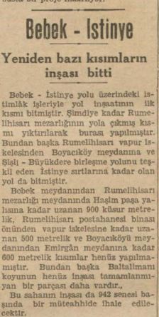 1942'de Bebek İstinye yol çalışmaları devam ediyormuş. O zamana kadar Rumelihisarı mezarlığının yola çıkmış kısmı yıkıltarak bursı yapılmış. Sonra Rumelihisarı vapur iskelesinden Boyacıköy meydanına ve Şişli-Büyükdere birleşme yoluna teşkil eden istinye sırtlarına kadar olan yol da bitmiş.