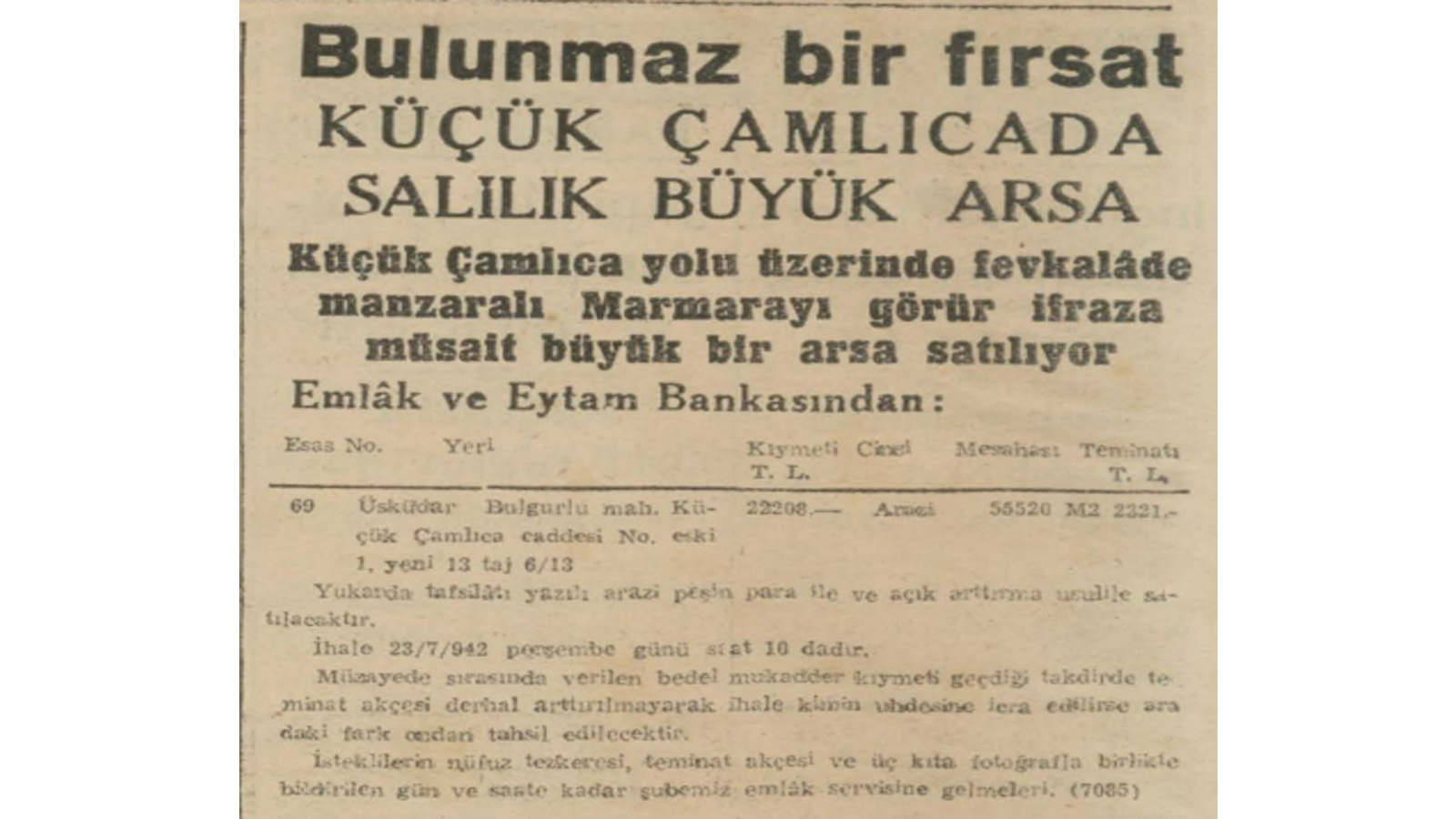 1942'de Emlak ve Eytan Bankası Küçük Çamlıca'da marmarayı gören büyük müstakil bir arsa satışının yapılacağınını duyurmuş.