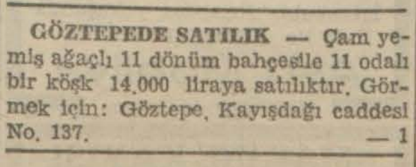 "Çam yemiş ağaçlı 11 dönüm bahçesi ile 11 odalı bir köşk 14.000 liraya satılıktır. Görmek için: Göztepe, Kayışdağı caddesi No. 137."