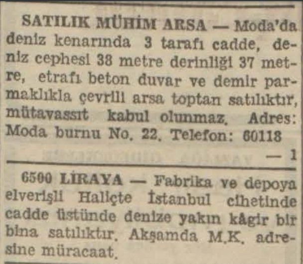 "SATILIK MÜHİM ARSA - Moda'da deniz kenarında 3 tarafı cadde, de- niz cephesi 38 metre derinliği 37 met- re, etrafı beton duvar ve demir par- maklıkla çevrili arsa toptan satılıktır, mütavassıt kabul olunmaz. Adres: Moda burnu No. 22. Telefon: 60118"