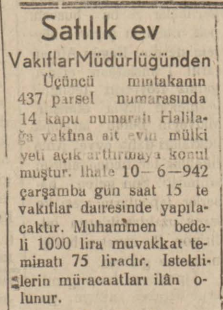1942 yılında Vakıflar Müdürlüğü tarafından 1.000 liraya ev satılıyormuş. İhale ile satılacak olan ev Halilağa Vakfı'na aitmiş. İşte detaylar...