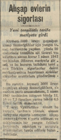 1942 yılında ahşap evlerin sigorta ücretlerine yapılan indirimler yürürlüğe girmiş. Söz konusu karar Türkiye'deki sigortacılar acentesine gönderilmiş.