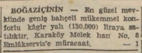 İstanbul Boğaziçi'nde 1942 yılında bahçesi olan yalı 130 bin liraya satışa çıkarılmış. Satılık ilanında yalının taş yapılı olduğu belirtiyor...