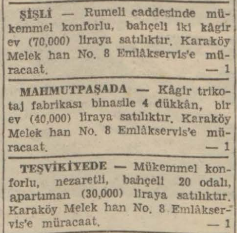 ŞİŞLİ - Rumeli caddesinde mükemmel konforlu, bahçeli iki kagir ev (70,000) liraya satılıktır. Karaköy Melek han No. 8 Emlakservis'e miracaat.