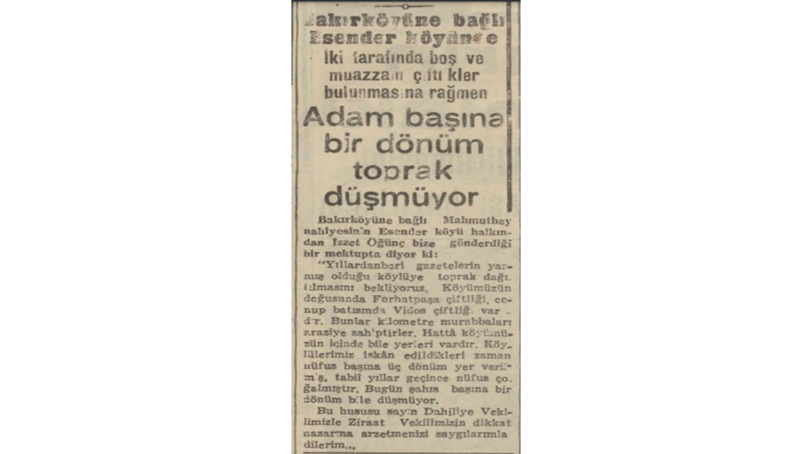 1942 yılından Bakırköy'e bağlı Esender Köyü'nde halk, mevcuttaki arazilerin yetersizliğinden isyan etti. Küylü halk bu durumu bir mektupla anlatmış. İşte ayrıntılar...