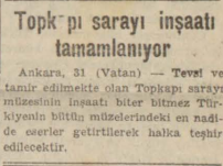 Ankara, 31 (Vatan) Tevsi ve tamir edilmekte olan Topkapı sarayı müzdnin inşaatı biter bitmez Türkiye'nin bütün müzelerindeki en nadide eserler getirtilerek halka teşhir edilecektir.