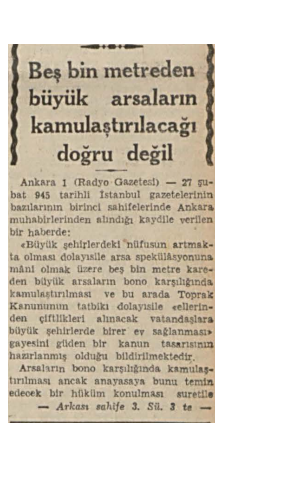 Söz konusu haber Cumhuriyet Gazetesi'nin 2 Mart 1945 yılındaki sayısında '' Şehirdeki arsalar'' başlığı ile kaleme alınmış. İşte o haber...
