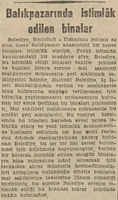 Söz konusu haber 2 Ağustos 1943 yılında Cumhuriyet Gazatesi'nde ' Balıkpazarı'nda istimlak edilen binalar' başlığı ile kaleme alınmış. İşte o haber...