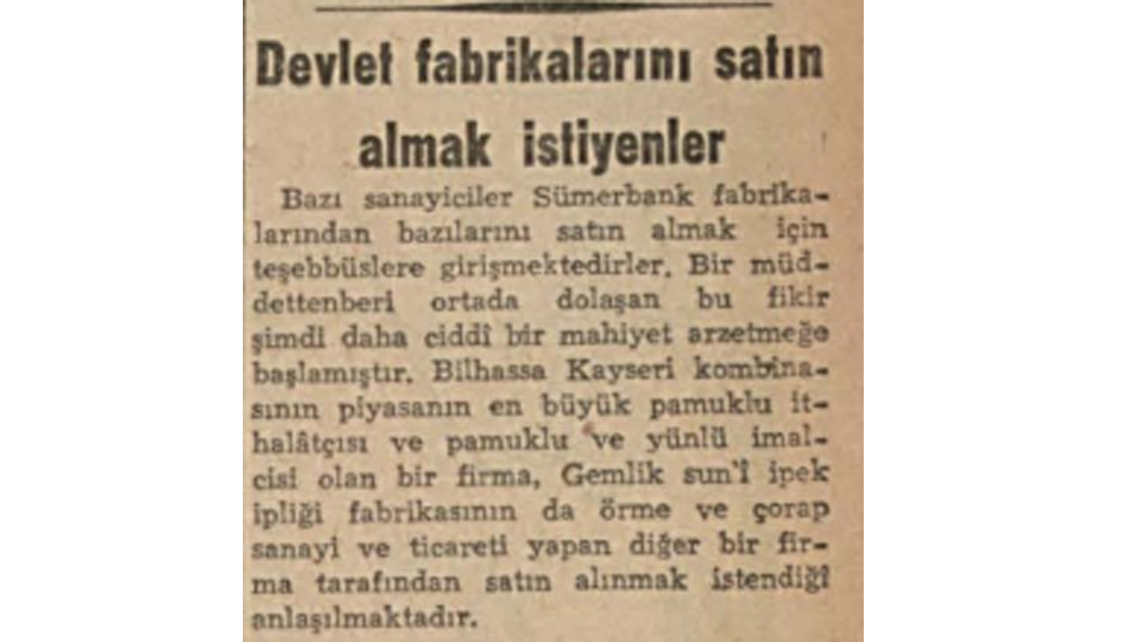 1946 yılında sanayiciler gözlerini devlet fabrikalarına dikmiş. Özellikle Sümerbank'ı almak isteyen sanayiciler ciddi araştırmalara başlamış. Söz konusu haber 14 Şubat 2024 Cumhuriyet Gazetesi'nde ''Devlet Fabrikalarını satın almak isteyenler'' başlığı ile kaleme alınmış. İşte o haber...