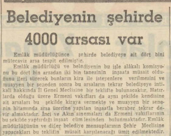 Hatırlarda olduğu üzere Ermeni vakıfları da aynı şekilde kendisine ait arsaları bu şekilde kiraya vermekte ve muayyen bir senenin hitamında arsa üzerine yapılan inşaatla beraber tekrar devir almaktadır. İnci ve Akın sinemaları da Ermeni vakıflarının bu şekilde yaptırdığı inşaat cümlesinden bulunmaktadır. Emlak müdürlüğünün ve diğer belediye mensuplarının Şehir Meclisine yapacakları bu teklifin müsait karşılanacağı ümit edilmektedir''