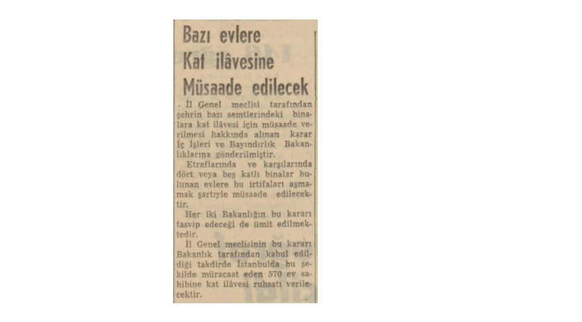 Bu ruhsat etrafında sadece 4 ila 5 katlı ev olan evler için verilmiş. Söz konusu haber 14 Temmuz 1952 tarinli Vatan Gazetesi'nin manşetinde ''Bazı evlere kat ilavesine müsaade edilecek'' başlığı ile yayımlanmış. İşte 14 Temmuz 1952 tarihli Vatan Gazetesi'ndeki o haber...