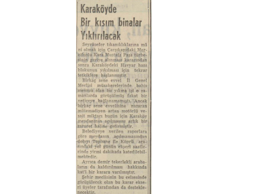 Söz konusu bu haber Vatan Gazetesi'nin 21 Ekim 1952 yılındaki sayısında '' Karaköy'de bir kısım binalar yıktırılacak'' başlığı ile kaleme alınmış. İşte o haber...