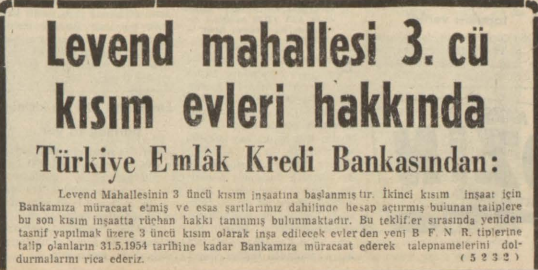 Söz konusu haber Vatan Gazetesi'nin 1 Mayıs 1954 yılındaki sayısında ''Levent Mahallesi 3. kısım evleri hakkında/ Türkiye Emlak Kredi Bankası'ndan'' başlığı ile manşette yer almış. İşte söz konusu o haber...