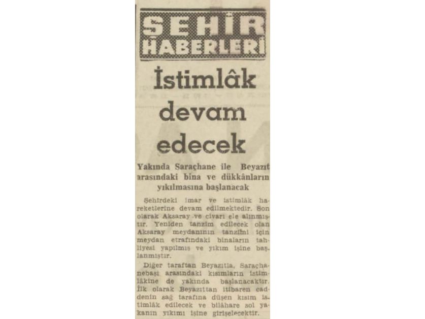 Sehirdeki imar ve istimlak ha reketierine devam edilmektedir. Son olarak Aksaray ve civarı ele alınmıştır. Yeniden tanzim edilecek olan Aksaray meydanının tanzini için meydan etrafındaki binaların tah liyesi yapılmış ve yıkım işine başlanmıştır.