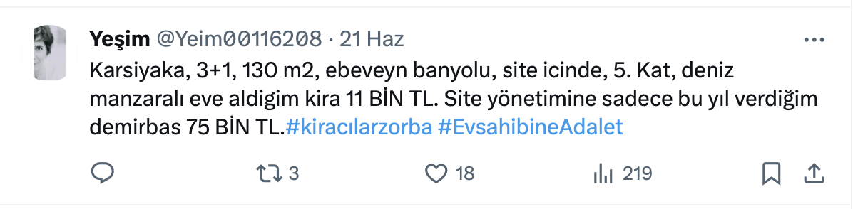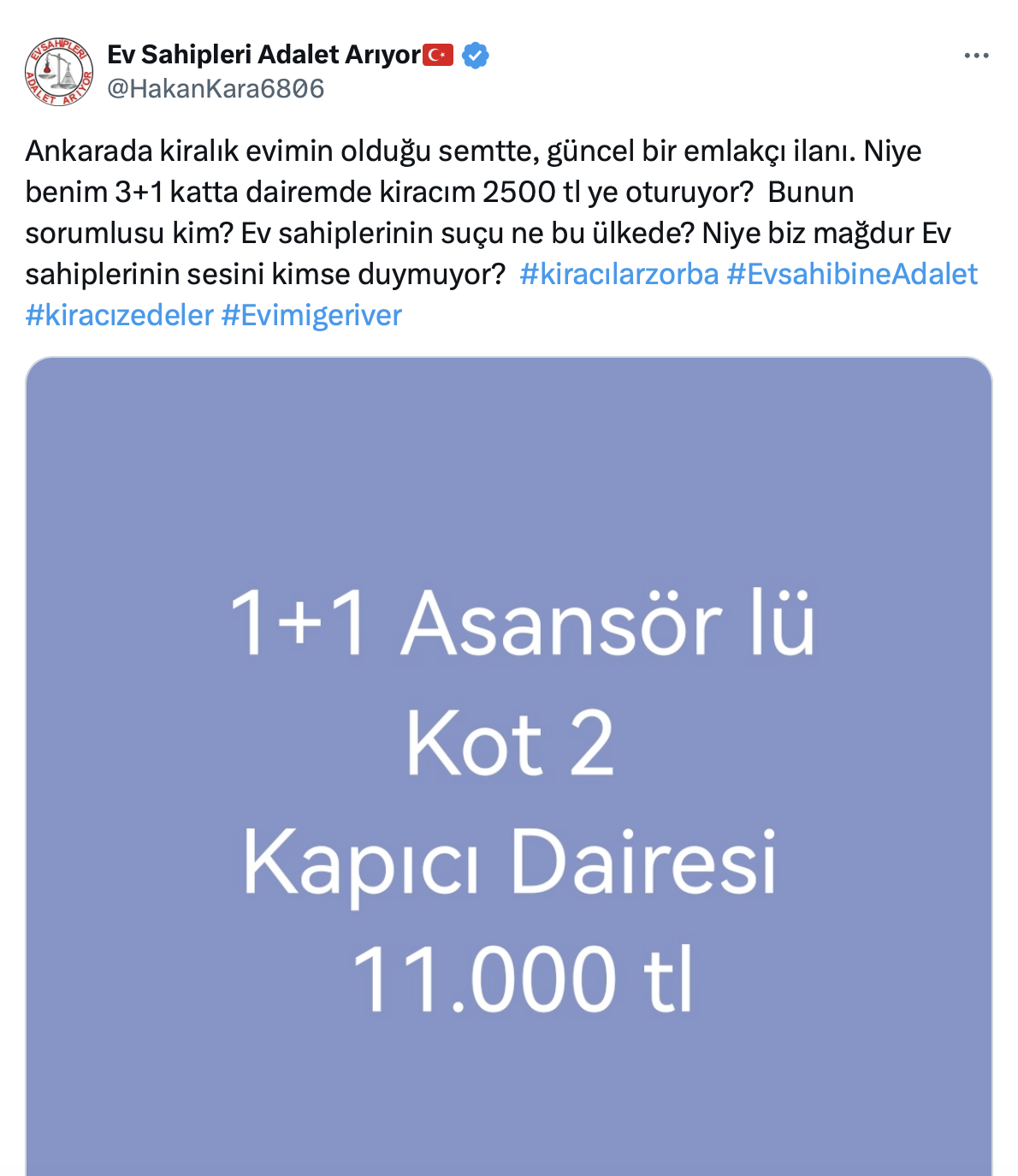 Mağdur ev sahibi Hakan Kara yaptığı paylaşımda “Niye benim 3+1 dairemde kiracım 2 bin 500 TL’ye oturuyor? Bunun sorumlusu kim? Ev sahiplerinin suçu ne bu ülkede? Niye biz mağdur Ev sahiplerinin sesini kimse duymuyor?” diye sordu.