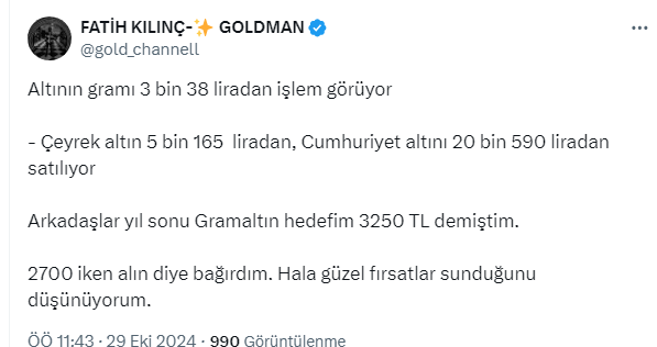 Uzman isim Fatih Kılınç, sosyal medya hesabı X'ten gram altının 3 bin 250 lira olacağını açıkladı.