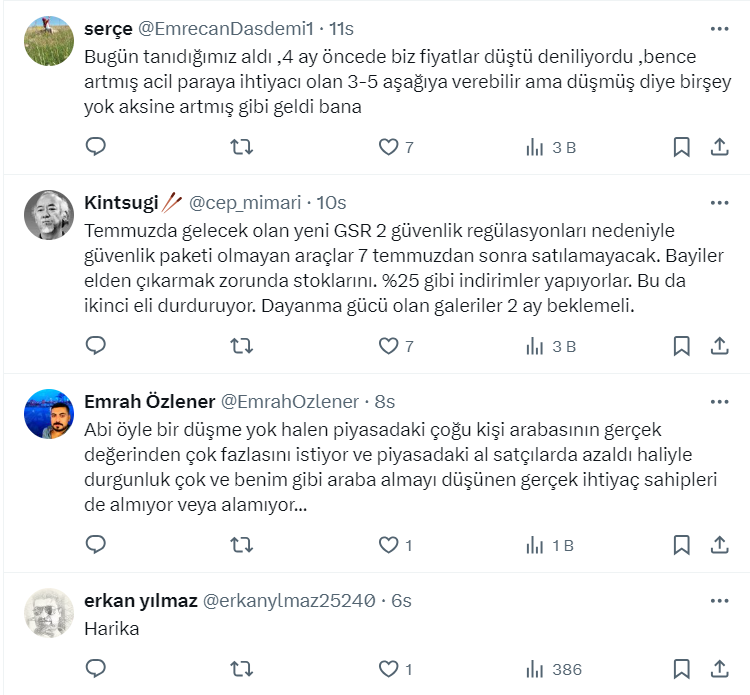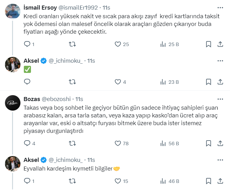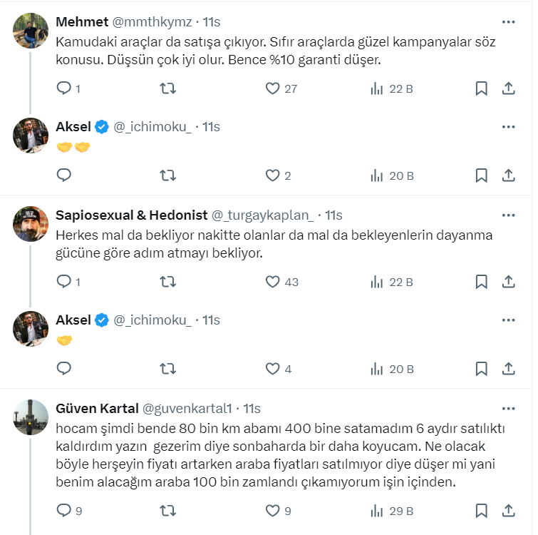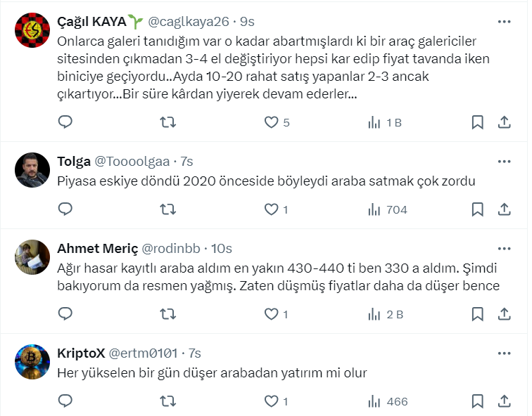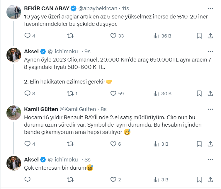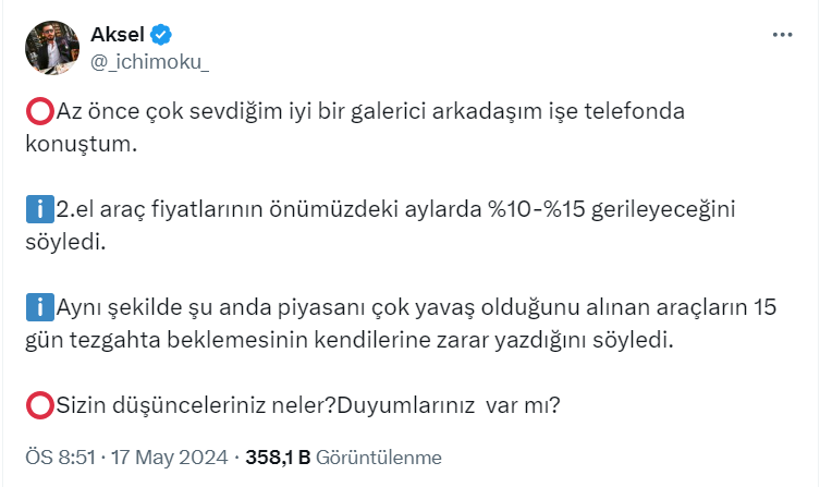 Toprak yatırımcısı ve danışmanı 41,6 bin takipçili Aksel isimli kullanıcı, https://twitter.com/_ichimoku_ X sosyal medya hesabından 2. el araç fiyatları ile ilgili bir paylaşım yaptı. Aksel paylaşımında az önce çok sevdiğim iyi bir galerici arkadaşı ile telefonda konuştuğunu belirterek, "2.el araç fiyatlarının önümüzdeki aylarda yüzde 10-15 gerileyeceğini söyledi" ifadelerini kullandı.
